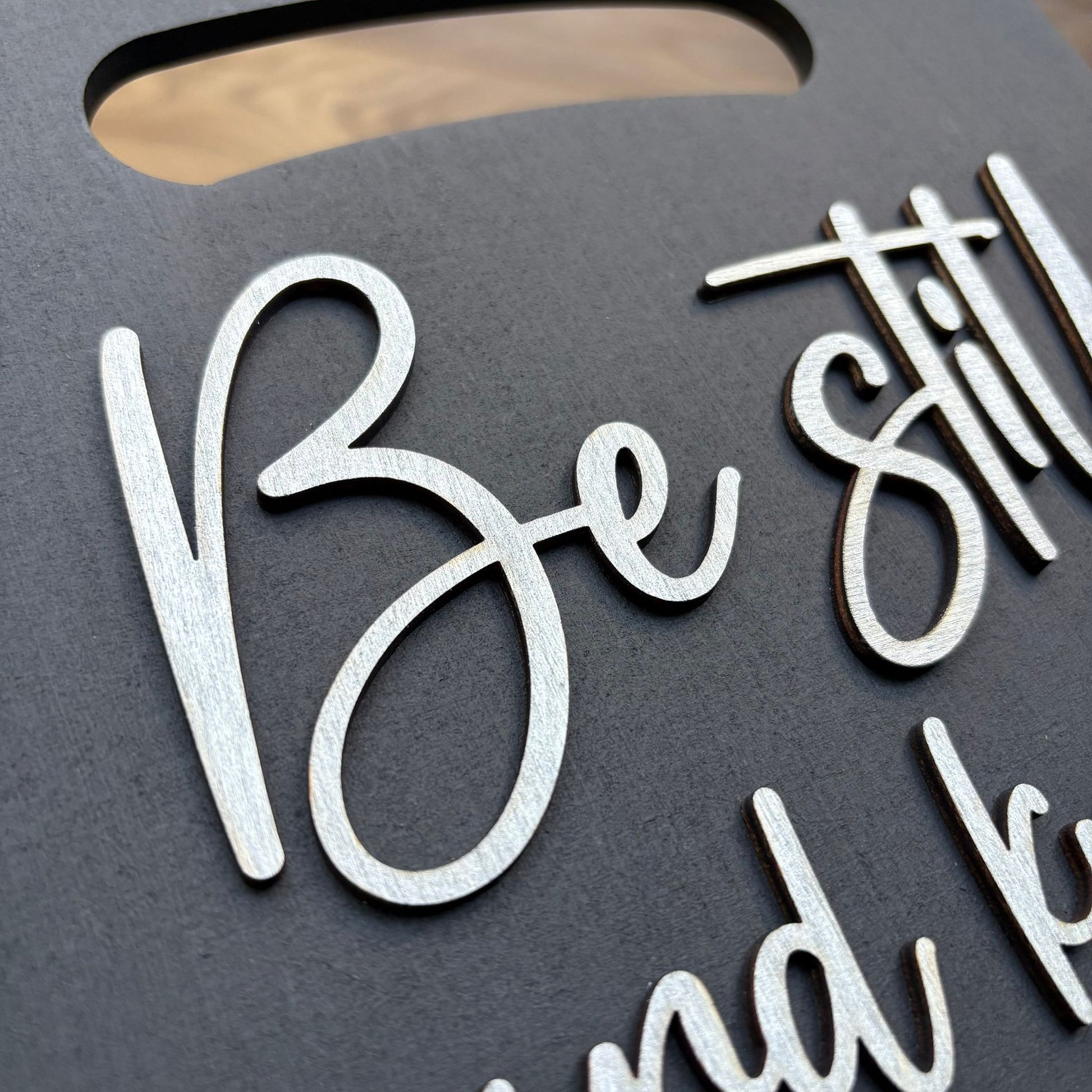 Wooden decorative piece with a painted back board and metallic silver lasercut lettering, giving a 3D relief effect.