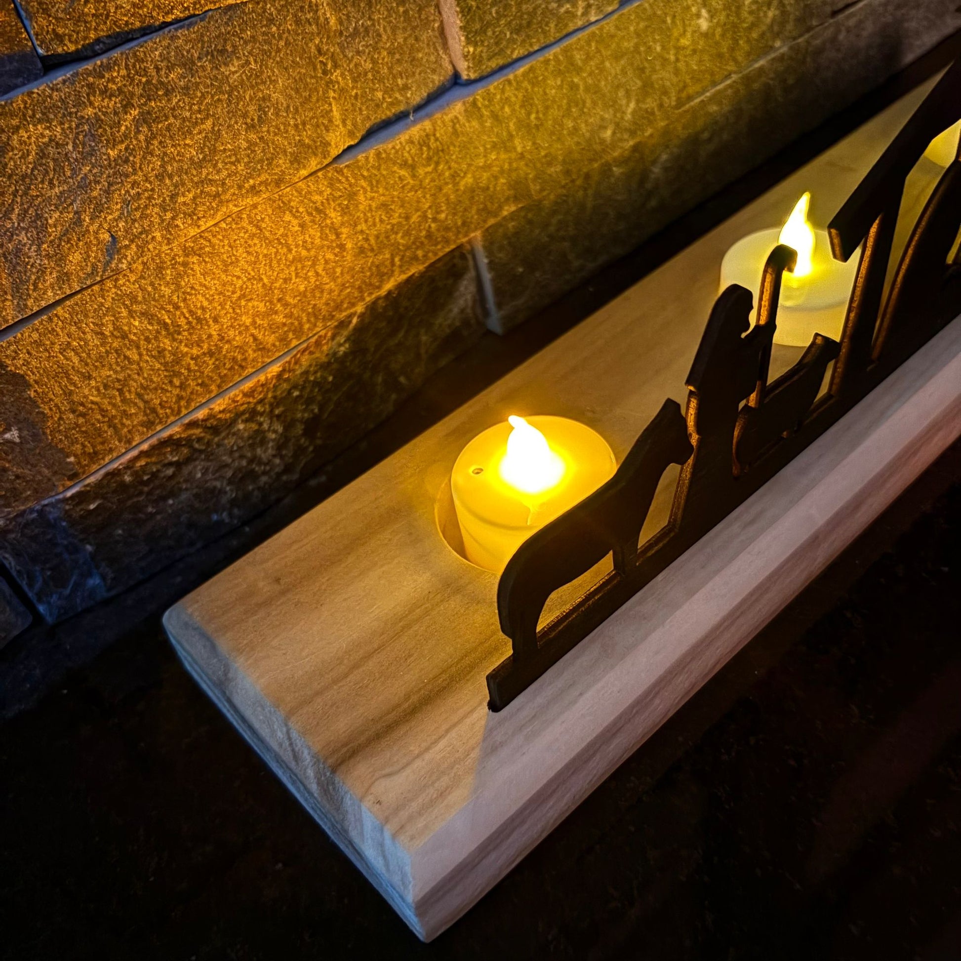 Our solid wood bases are handmade in our wee workshop here in Northern Ireland, and each is unique in its colouring and markings. At approx 350x90x25mm and with 3 recesses for tealights, they provide a sturdy, weighted foundation that highlights the natural grain of the timber.
