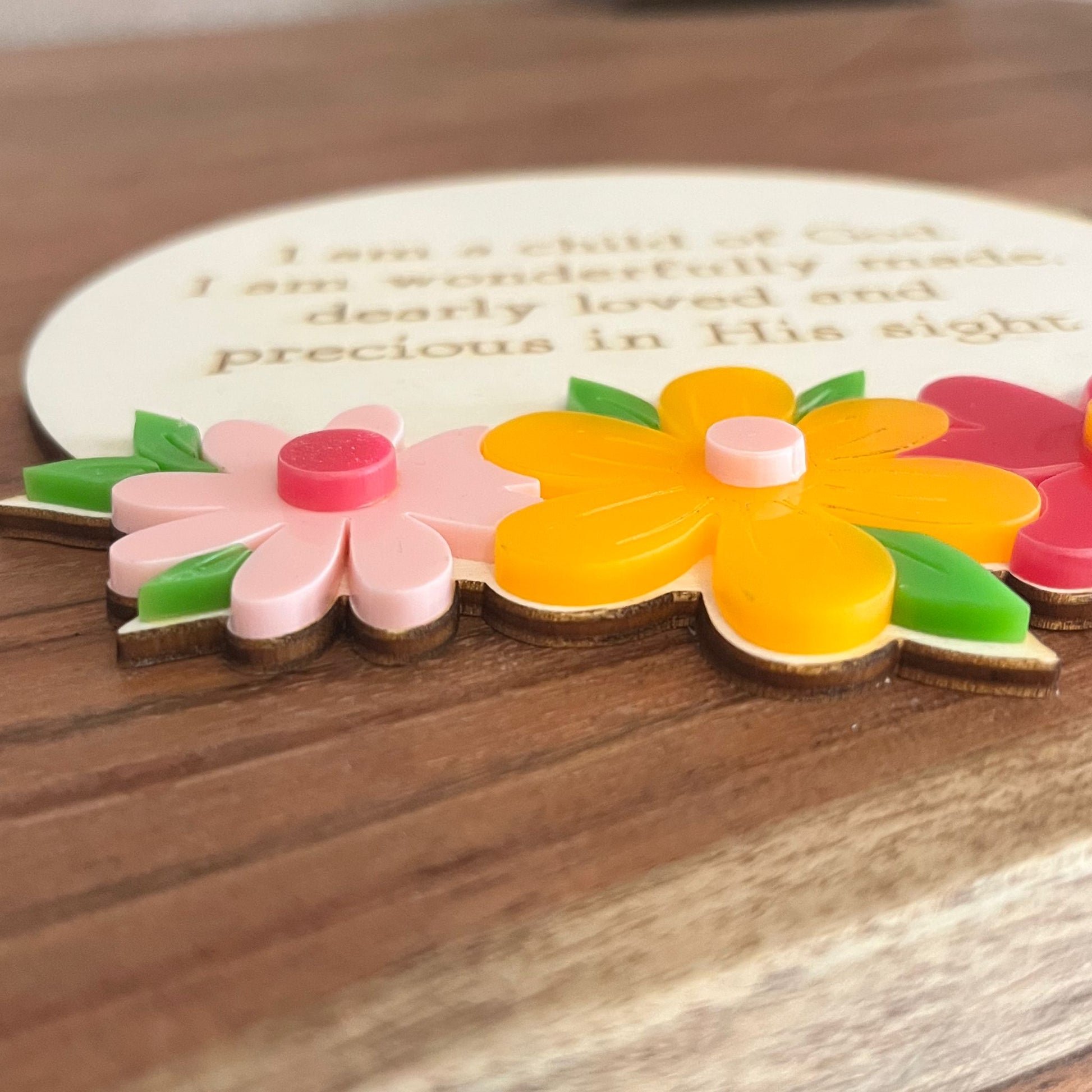Multi-layered laser engraved wooden plaque with acrylic flowers. Comes with its own wooden stand.