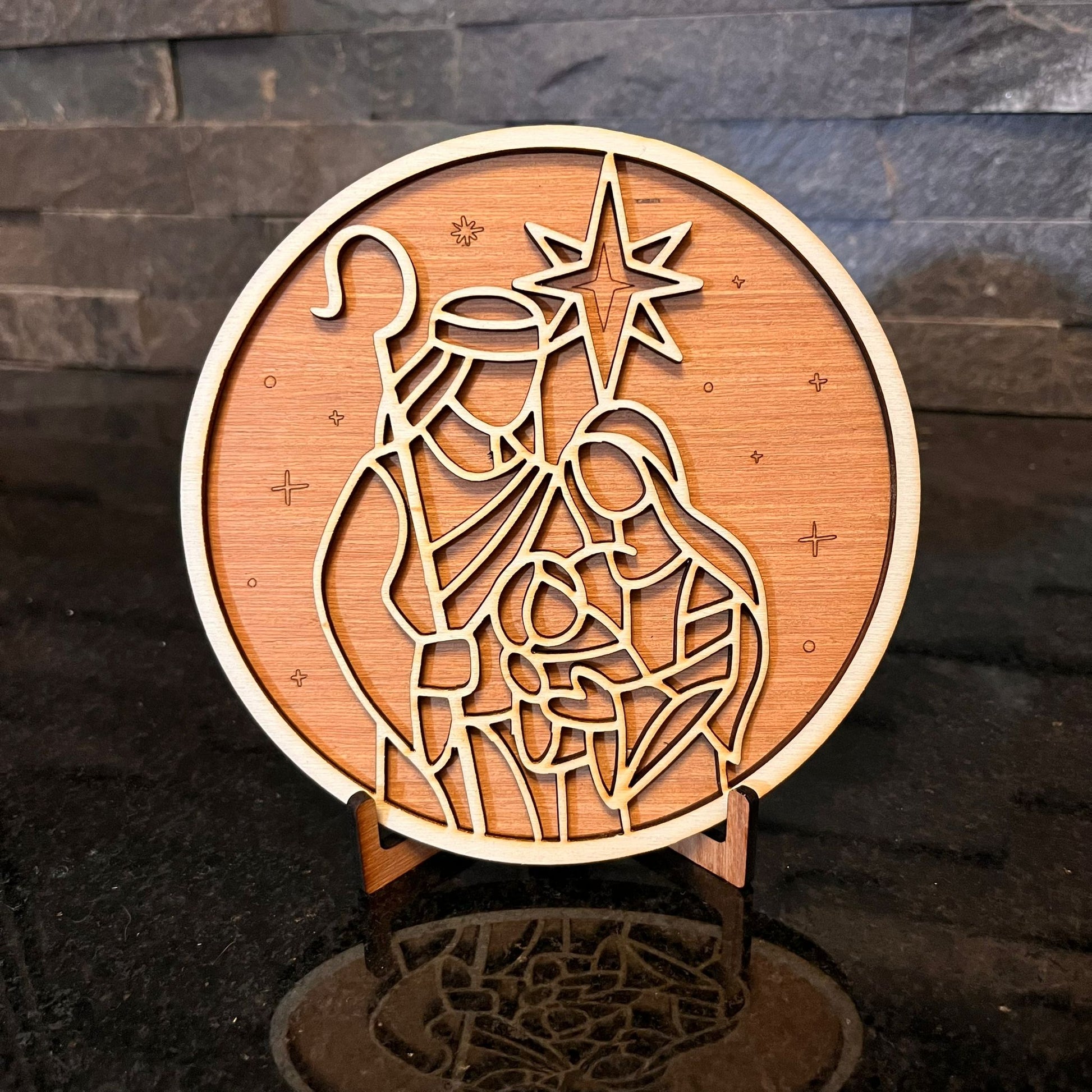 This plaque is made up of two layers of laser wood, with a hardwood backer and a poplar laser cut graphic, and comes boxed with it's own stand, which folds flat for easy storage each year.