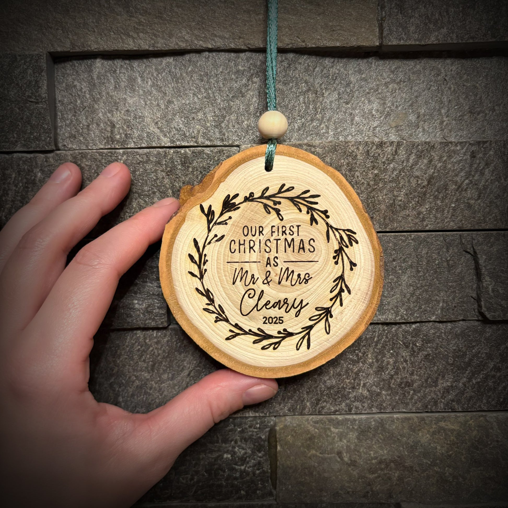 ❆ 'First Christmas as Mr & Mrs' personalised log slice bauble