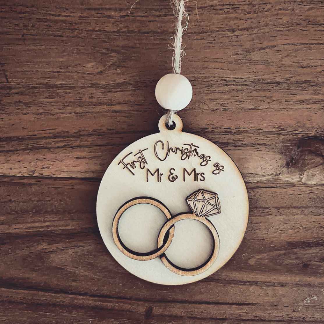 Laser engraved wooden Christmas bauble with a little extra sparkle, perfect for that first Christmas as Mr & Mrs.