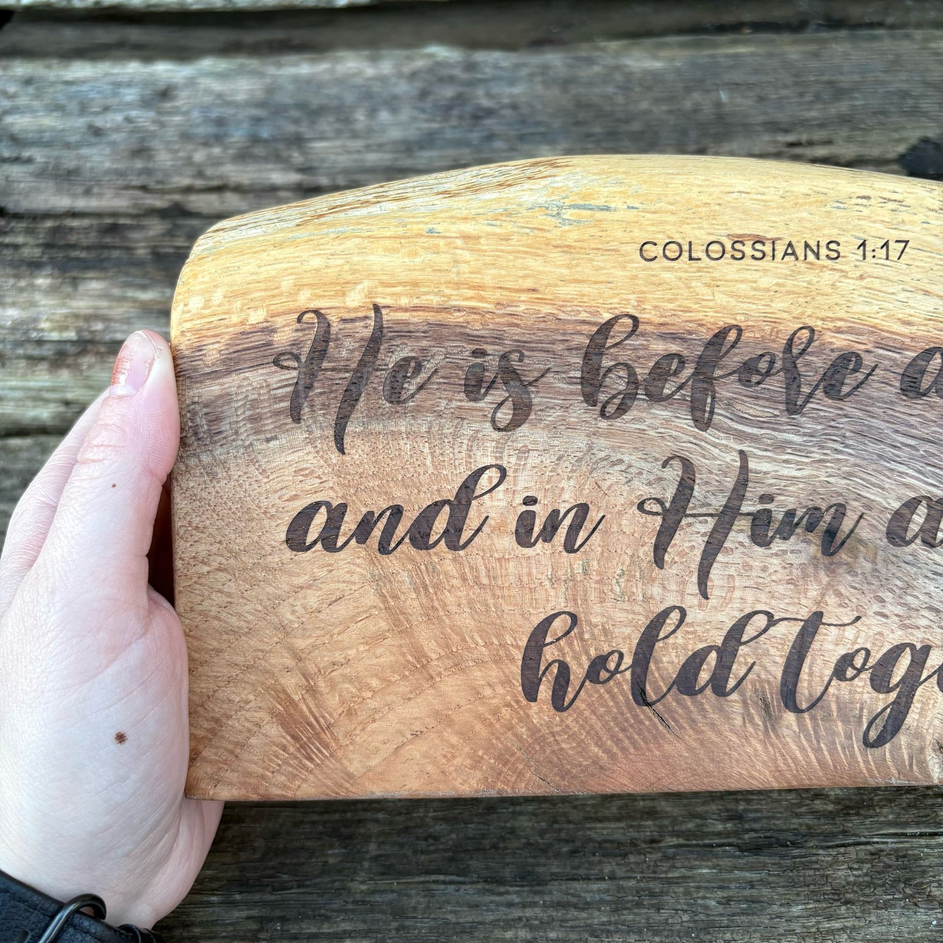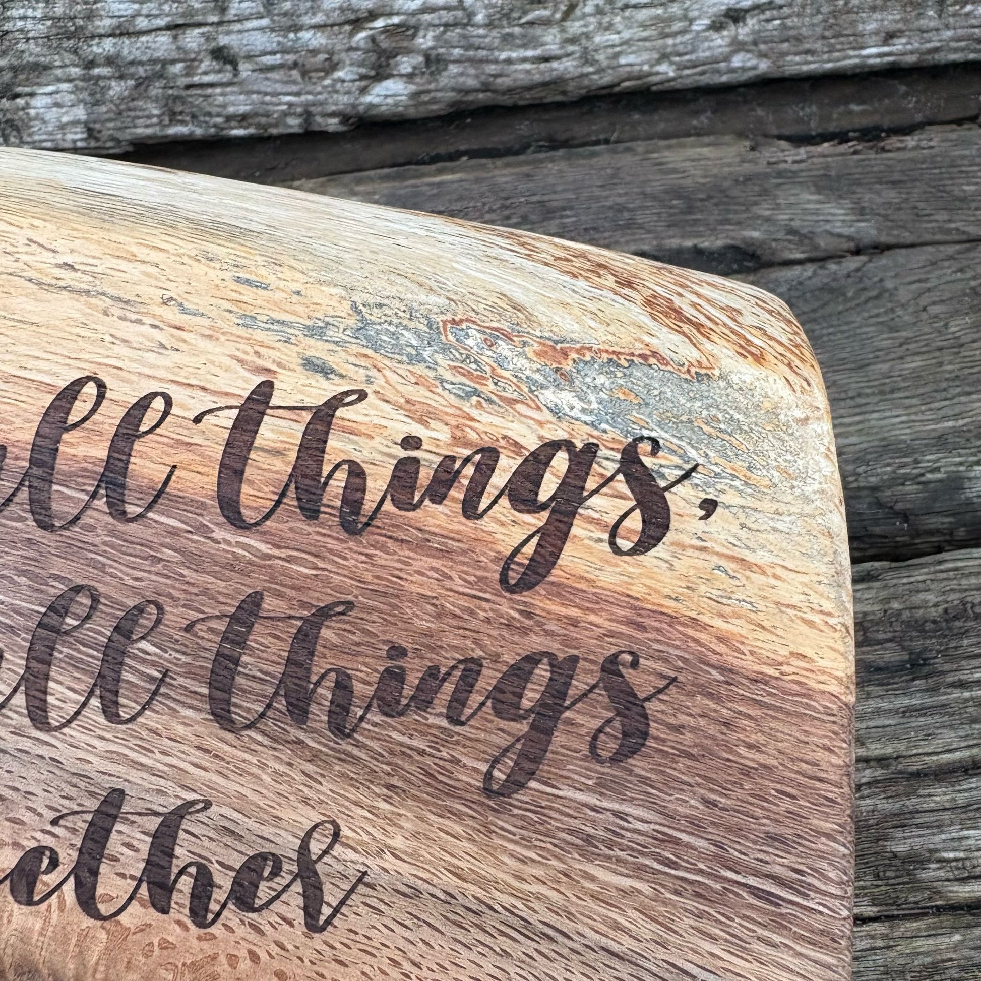 Live edge decorative plaque, laser engraved with a message to last a lifetime. It has been coated in danish oil, and is unique in its size, shape and markings. It has a flat bottom, and at almost 2" thick, stands independently.