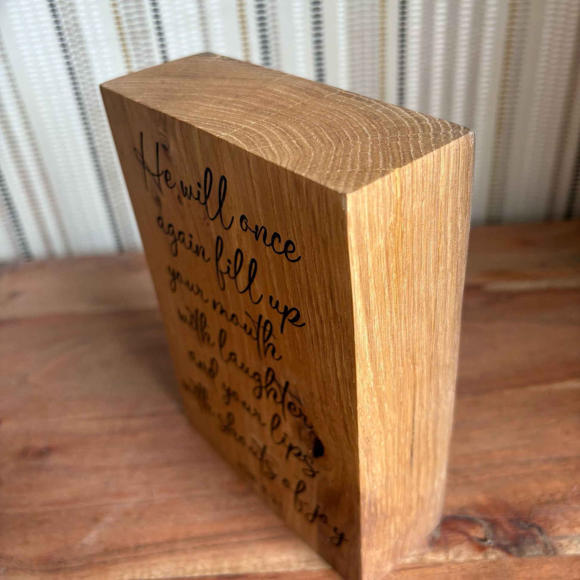 'He will once again fill up your mouth with laughter' solid wood decorative plaque