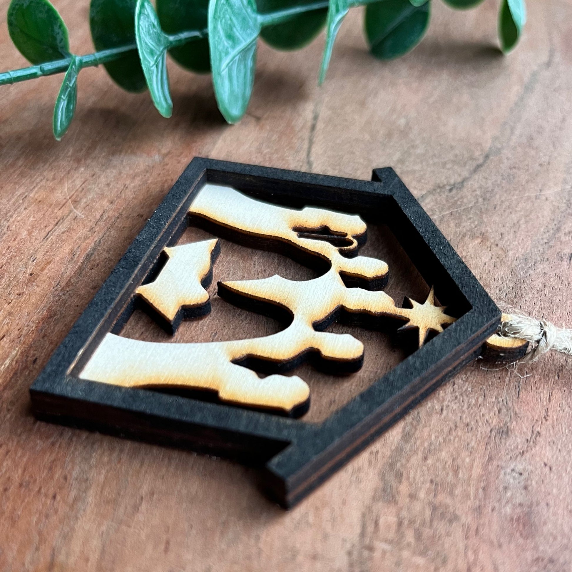 Laser cut Christmas bauble, based on the birth of Christ. This bauble is made from two layers of laser wood, with the top layer stained black.