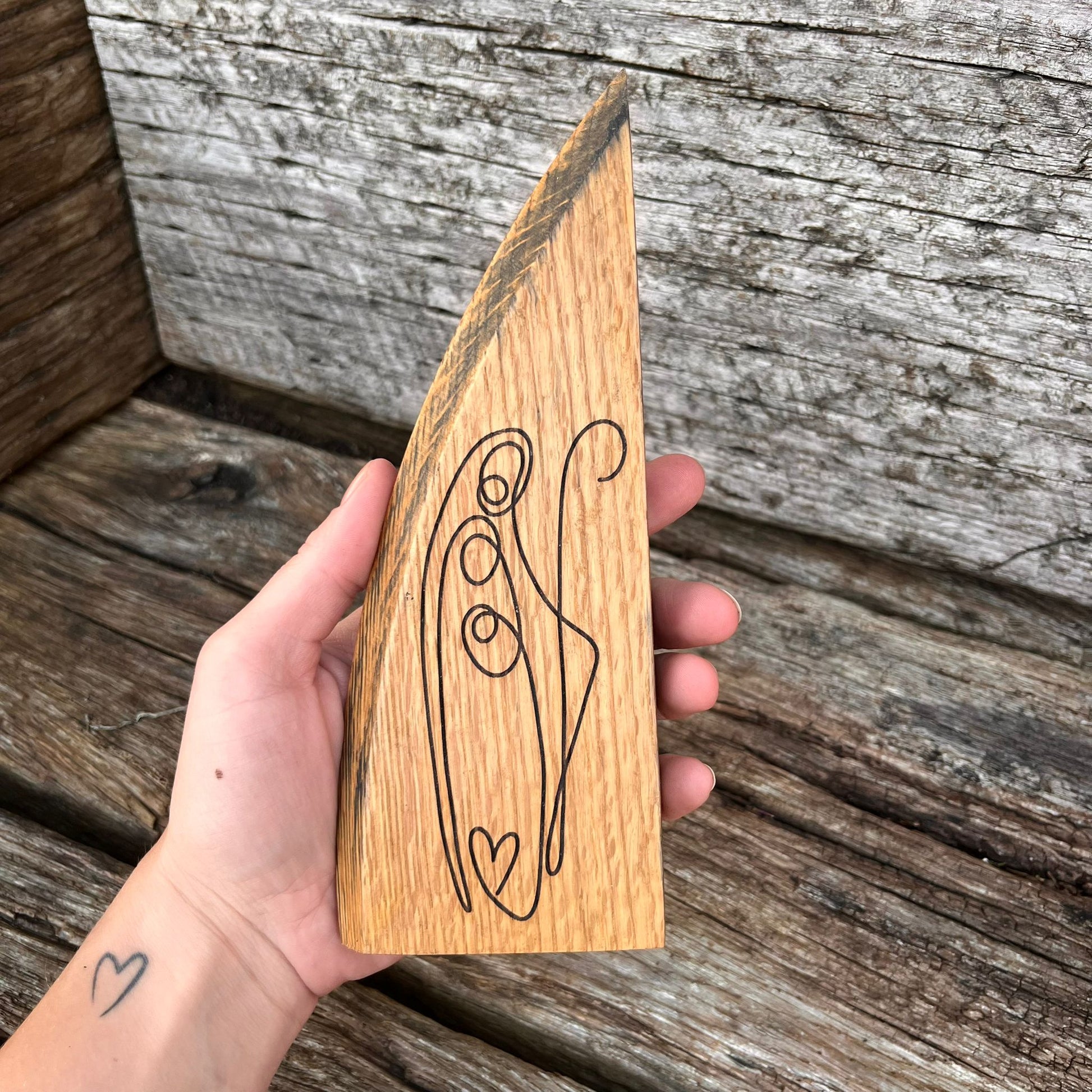 Laser engraved plaque made from a reclaimed barrel, which has been stripped back to reveal the white oak and coated in Danish oil. Original charring from the barrel on the reverse, locked in with hard wax oil to keep all that goodness and history without fear of it marking its surroundings. This piece stands itself, and is completely unique in its size, shape and markings.