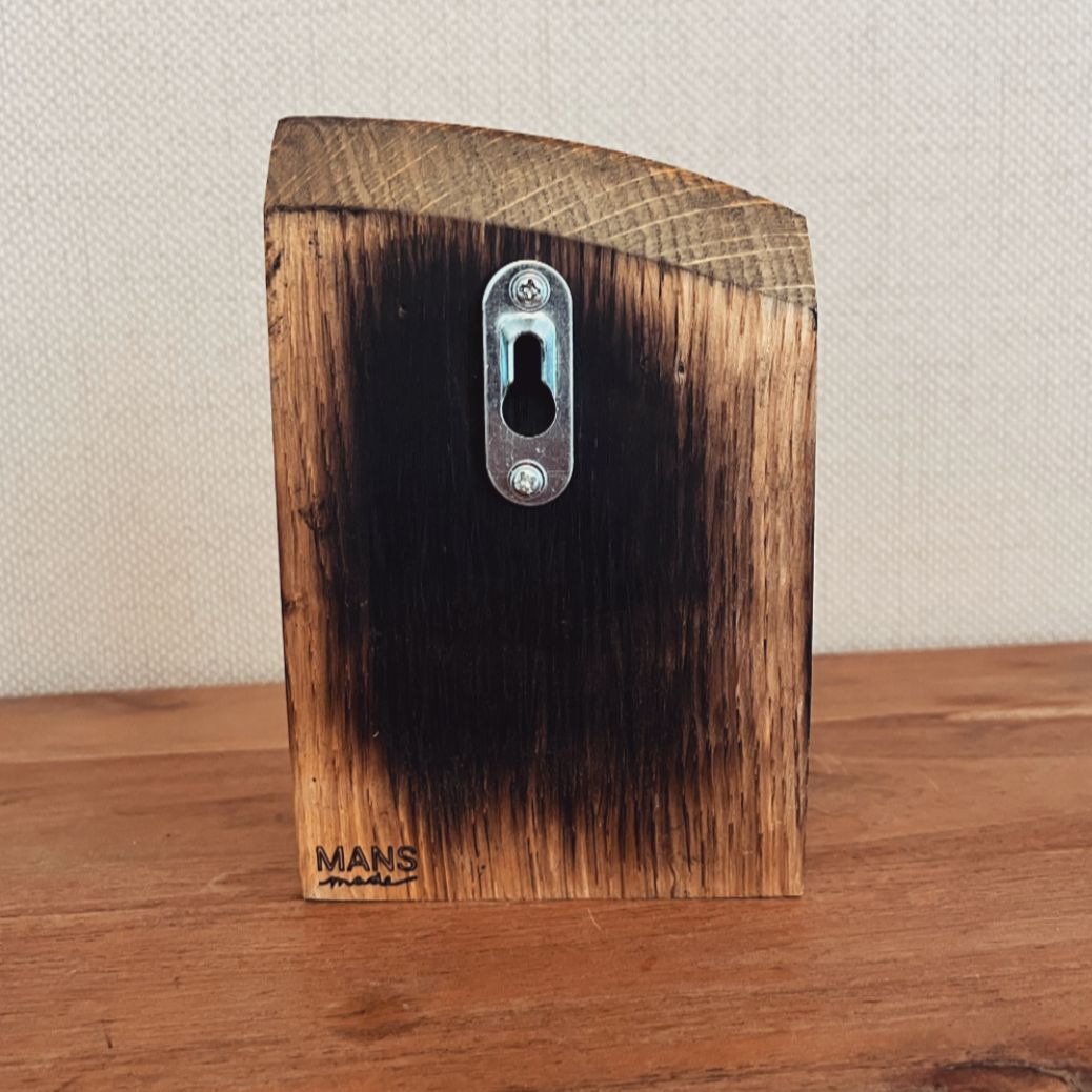 Laser engraved plaque made from a reclaimed barrel stave, which has been stripped back to reveal the white oak and coated in Danish oil. Original charring from the barrel on the reverse, locked in with hard wax oil to keep all that goodness and history without fear of it marking its surroundings. This piece stands itself, but also has a hook on the reverse for wall mounting, and is completely unique in its size, shape and markings.