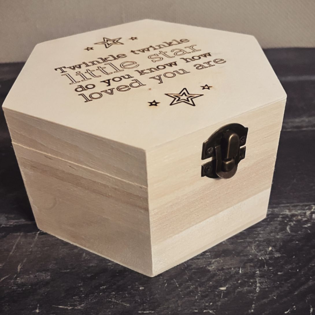 Hexagonal box with metal clasp, laser engraved with a message to last a life time. Perfect for gifting to a new baby.