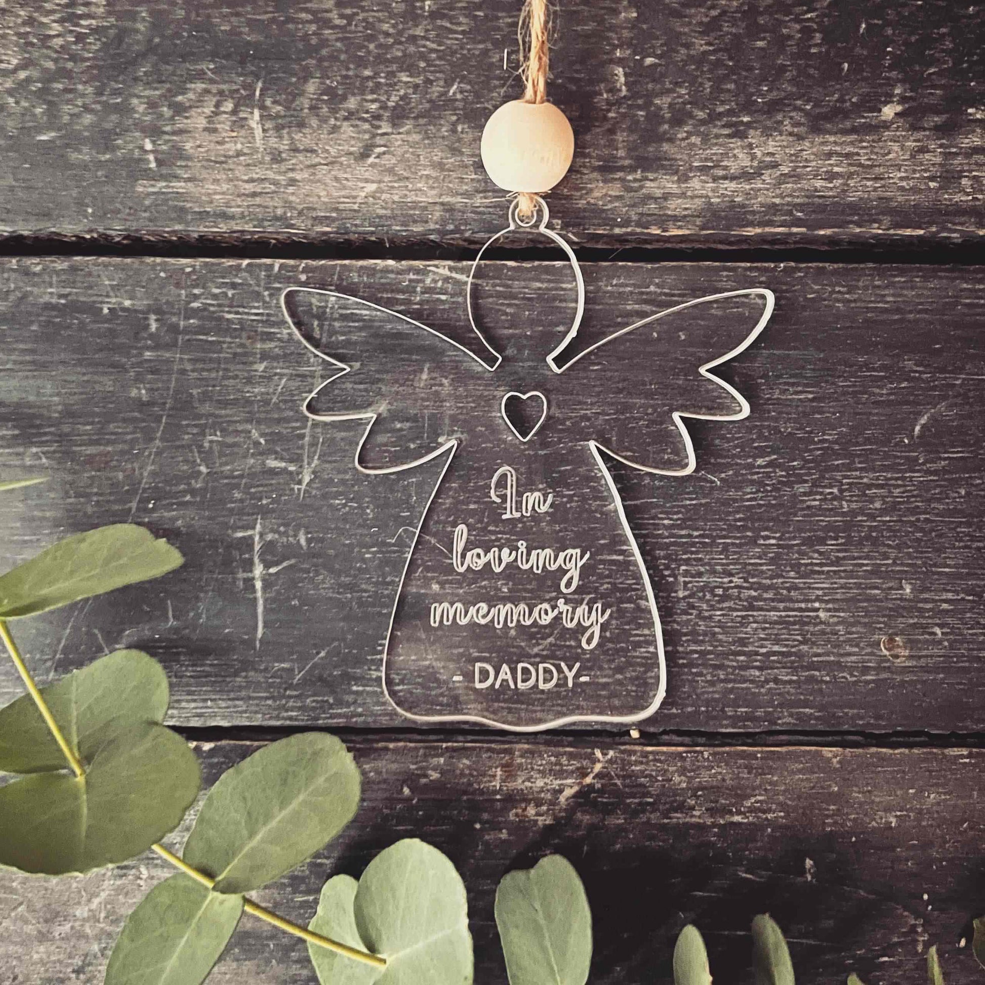 Remembrance baubles, laser engraved with ‘In loving memory’.